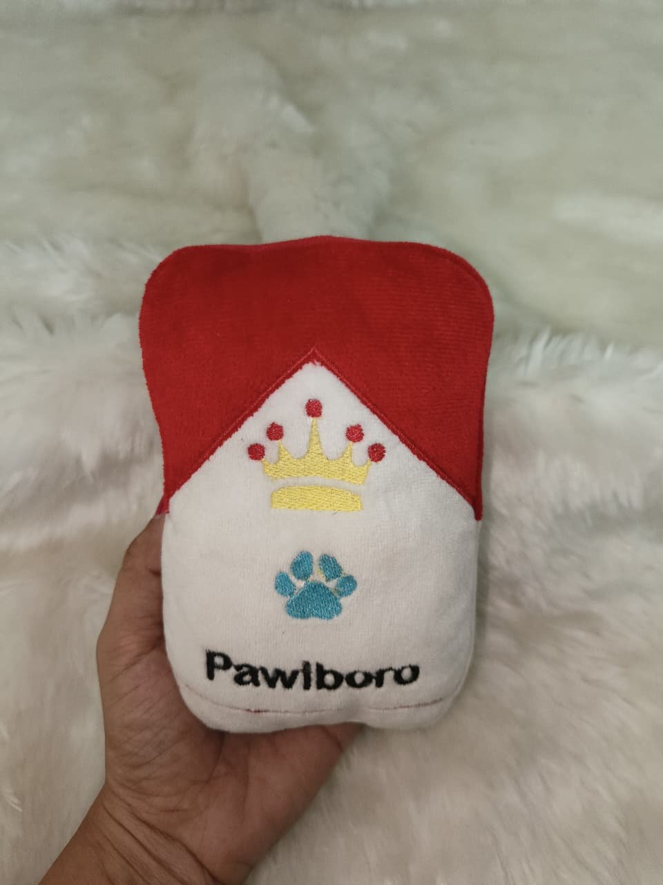 Inspired by a classic pack-style design, this adorable plush features a red-and-white look, a golden crown, and a cute paw logo, making it both eye-catching and fun for pets to carry around. Its soft fabric makes it perfect for snuggling, gentle chewing, and interactive play.